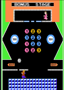 ・C画面 下にいるマリオを左右に移動させ、ボールを打ち返す ボールが真ん中の数字部分に触れると色が黄→青→赤→黄の順に変化し、赤色が多くなるとポリーンの足場が開いていく ポリーンが開いた足場に移動すると落下してくるのでマリオで受け止める。受け止めることに失敗するとボールを1つ失う。 ポリーンを受け止めてExitまで移動させるとボーナスポイント(10000ポイント)入手できる ボールが画面一番下まで落ちると、A画面に移動する